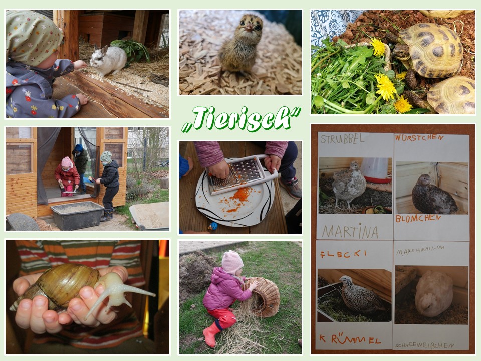Im Kindergarten leben Achatschnecken, Zwergkaninchen, Schildkröten und Wachteln. Die Zwergkaninchen und Wachteln leben ganzjährig draußen. Die Ortschaft Cossebaude unterstütze in der Anfangszeit (2021) mit Fördermitteln den Bau des Wachtelstalls.